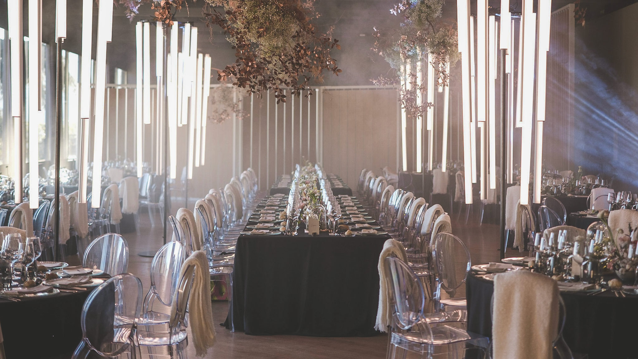 En estaciones como el otoño o el invierno, parece más conveniente celebrar el evento en localizaciones interiores y no por ello el mobiliario, el menaje o la decoración debe dejar de ser igualmente impactante.
