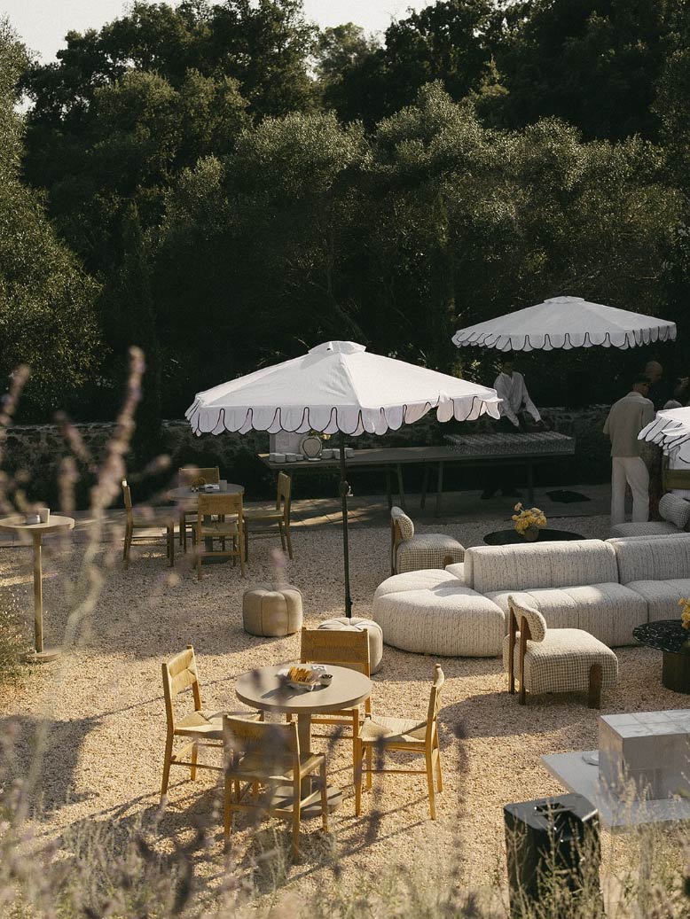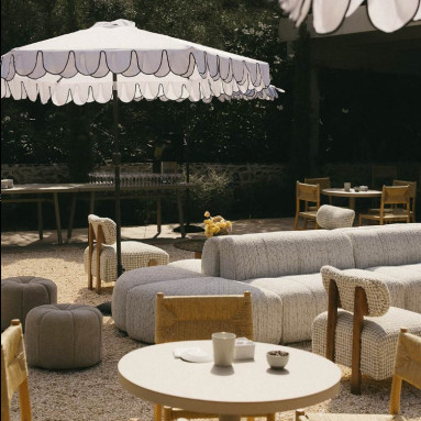 Chillout con mesa Paypay, banco macramé grande, pufs de yute natural, parasoles de esparto y sillón Enmanuelle.