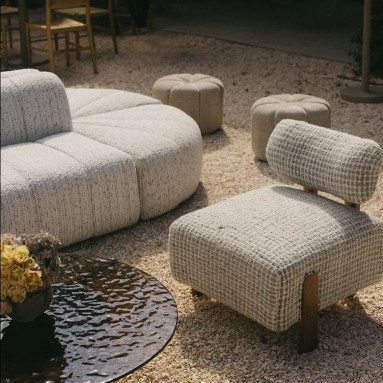 Montaje con banquetas grises, butacas y sofá capitoné.